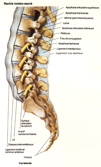 représente donc la portion terminale de la colonne vertébrale surplombant le bassin ; comme décrit dans la partie traitant de la hernie discale lombaire, elle est constituée par l'empilement de 5 pièces osseuses appelées vertébres lombaires.